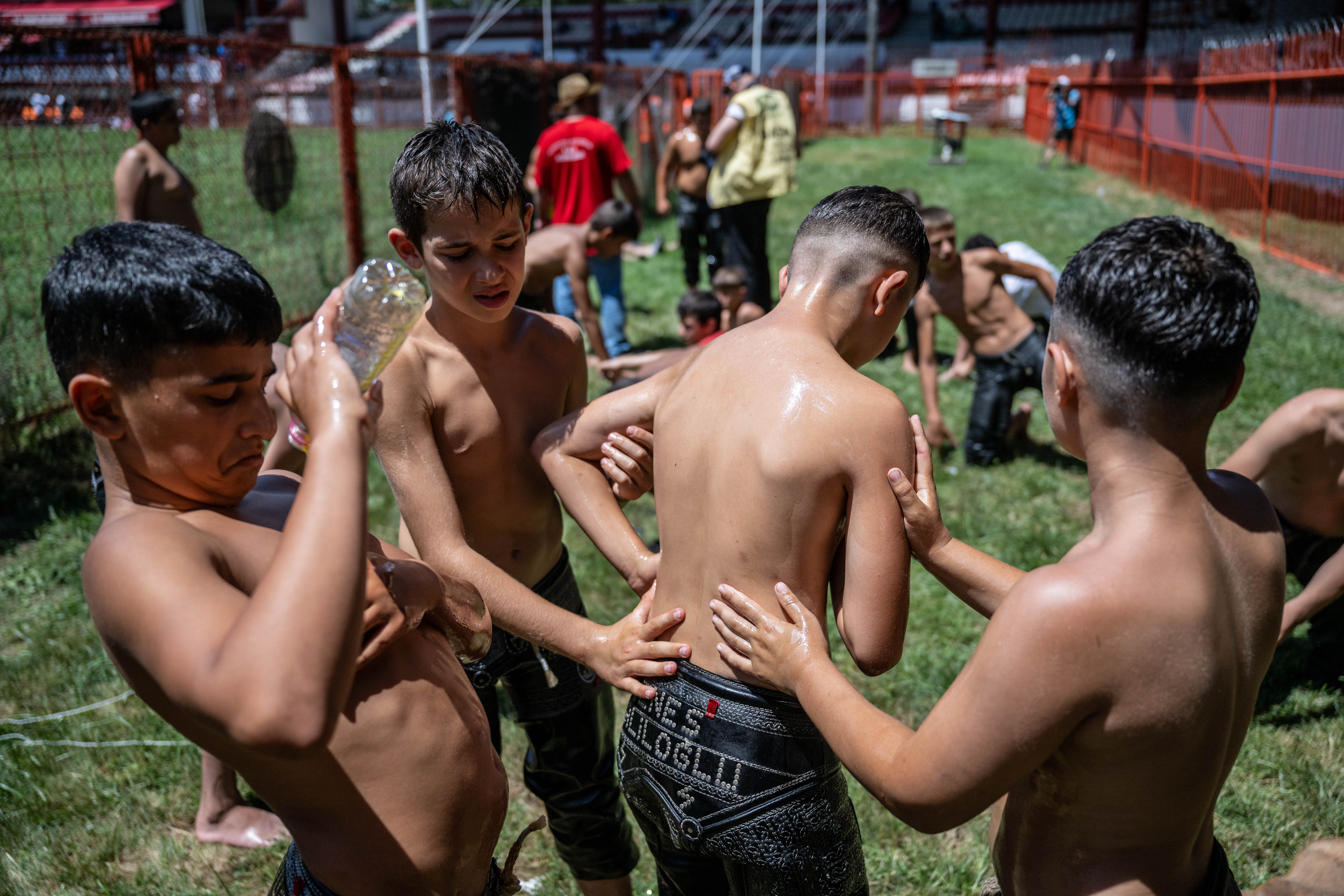 663. Kırkpınar Yağlı Güreşleri'nde heyecan minik 1 boy pehlivanların güreşleriyle başladı. Cuma namazının ardından Edirne Sarayiçi Er Meydanı'na gelen pehlivanlar, kule hakemlerinin çağrısıyla hazırlıklarını tamamladı. Minikler, yağlanmanın ardından rakipleriyle kol bağladı.