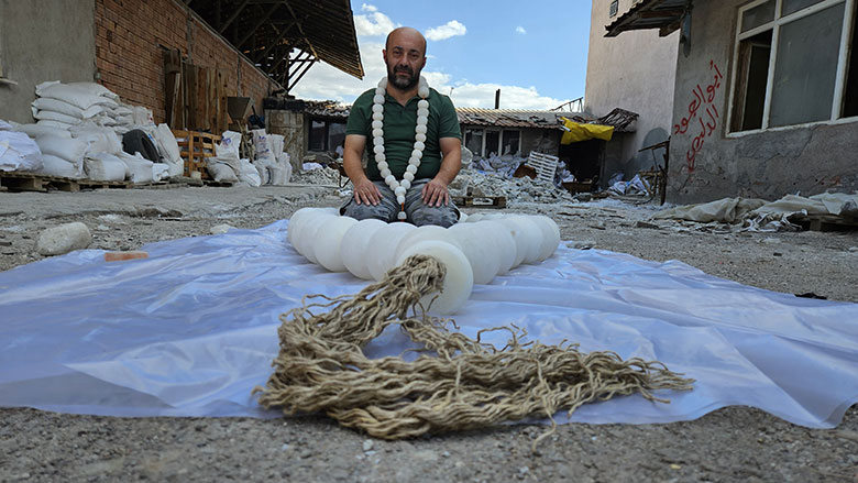 Gümüş, kente geldiğinde bir arkadaşının atölyesinde makine ile kesip işlediği kaya tuzundan 33 boncuk oluşturdu. İmameyi de kaya tuzundan hazırlayan Gümüş, bir araya getirdiği 33 boncuk ile 3 metre 33 santimetre olan tespihini tamamladı.
